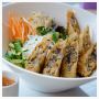 Reisnudeln, viet Frühlingsrollen, Thai Basilikum, Erdnüsse, Pfefferminz, Sojasproßen, Fishsauce - kalt serviert