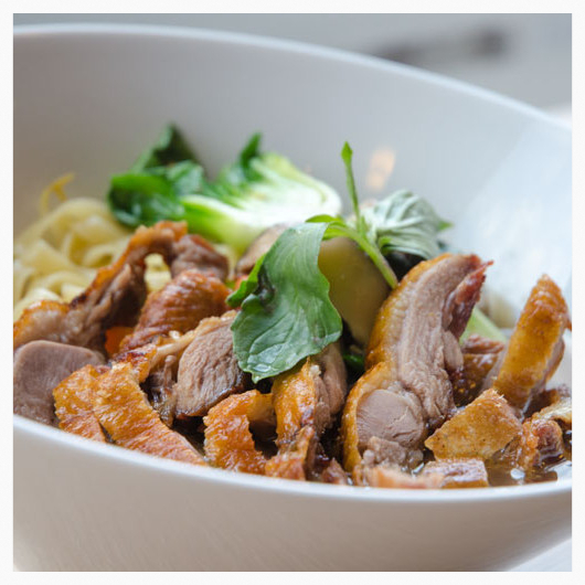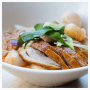 Bandnudeln, knusprige Ente, Pak Choi, Champions, Koriander, Sojasproßen, Shiitake - Pilze in Brühe