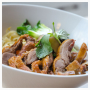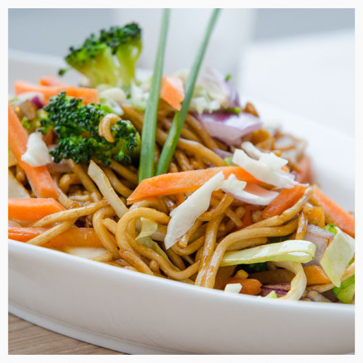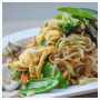 Gebratene Nudeln, Ei und verschiedene Gemüse, wahlweise mit Hähnchenbrust oder Crispy Chicken