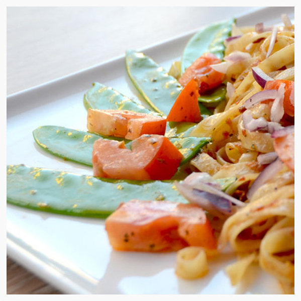 Tagliatelle, Kaiserschote, Tomate, Cashew, Tofu in Asia-Pesto