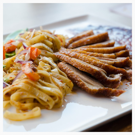 Tagliatelle, knusprige Ente, Kaiserschoten, Tomaten, Cashewnüsse in Asia-Pesto