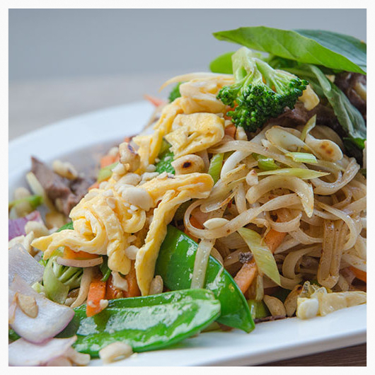 Reisbandnudeln, Rind, verschiedene Gemüse, Thai-Basilikum, Erdnüsse, Tamarind-Sauce