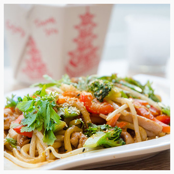 Udon-Nudeln gebraten, Huhn, Sesam, Kaiserschoten, Karotten, Lauch